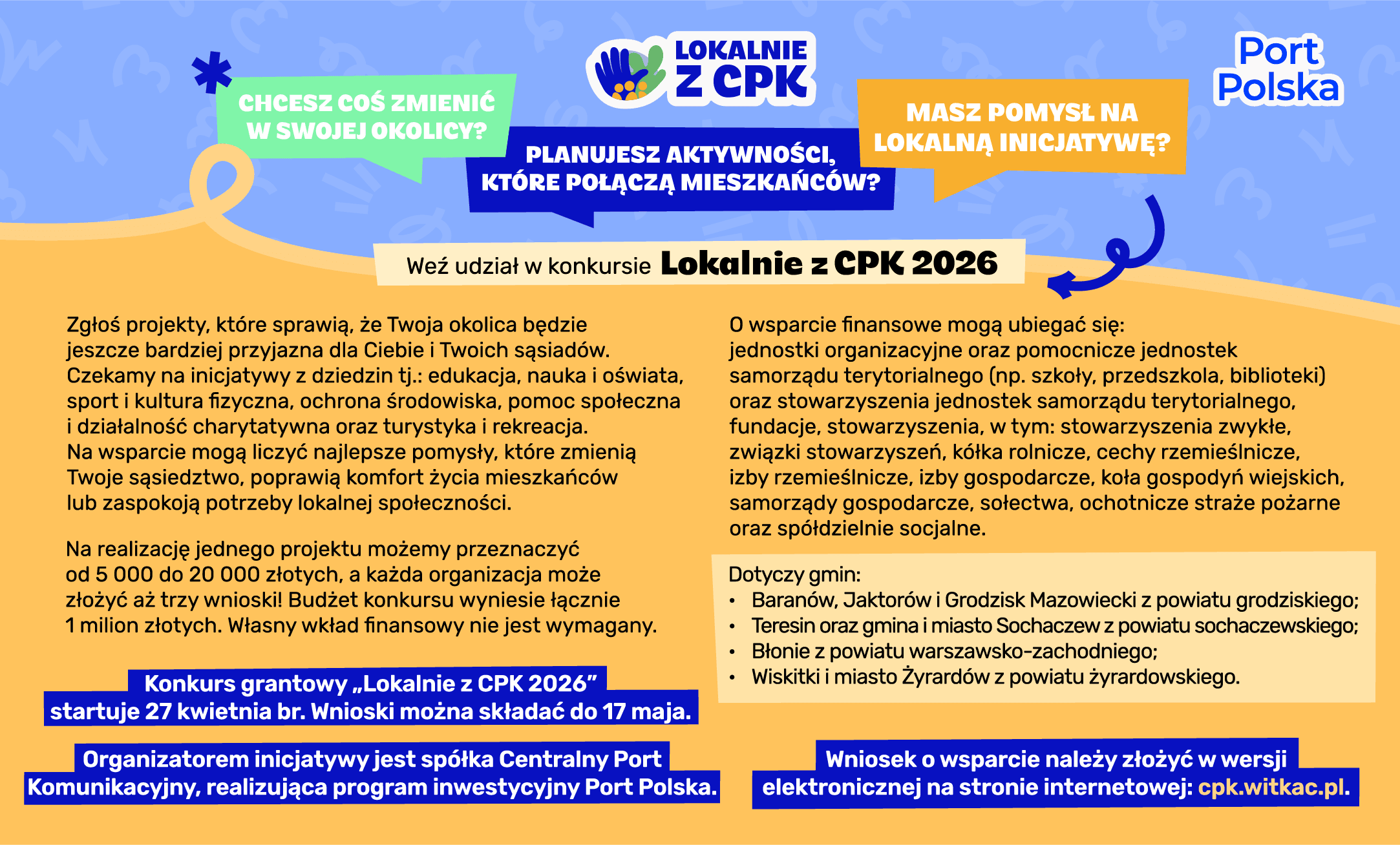 Spółka Centralny Port Komunikacyjny, realizująca program inwestycyjny Port Polska, rozpoczyna nabór wniosków do konkursu „Lokalnie z CPK 2026”. Łączna wartość grantów wyniesie 1 mln zł.